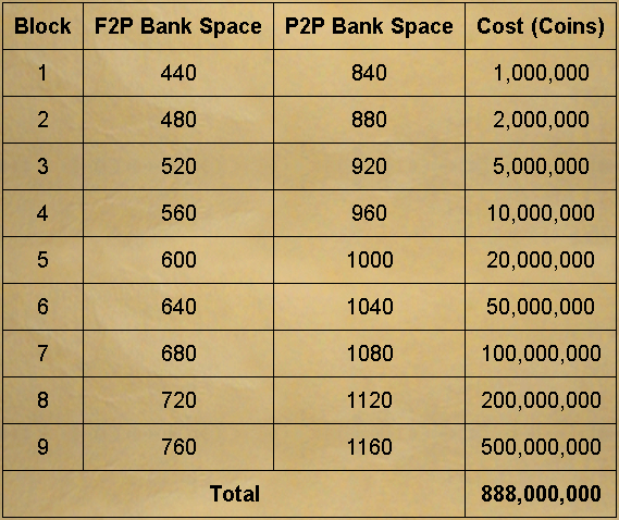 The third method Jagex is using to remove gold relates to bank space. Banks are the primary storage method used by players in Old School Runescape. Currently, there is a hard cap of 816 items that can be stored in a bank. If this proposal was to go through then this would be raised to 1200. Although, acquiring this extra bank space would be very expensive, costing just under 900 million gold.