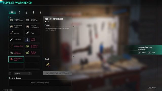 Once you have yourself a rod, you need some bait. You will find the vendor Margerie on one of the many docks around the game. She will sell many types of bait. Making a Dough Fish Bait at your Supplies Workstation using four corn is also possible. I suggest buying yourself the regular bait from the vendor, though.