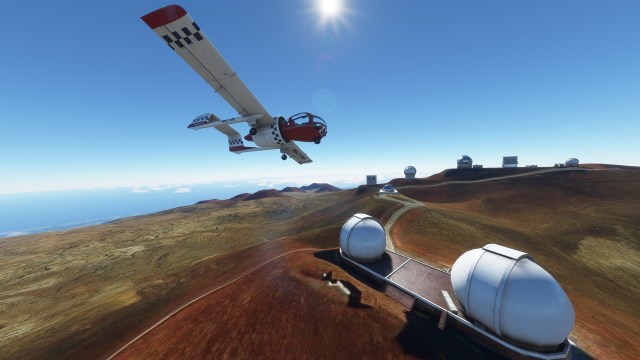 I’m also trying out Just Flight’s new Piper Turbo Arrow props around the Hawaiian Islands, and the big island of Hawai’i just so happened to be the perfect spot to take out ORBX’s Optica for a spin. What’s so special about this island? It’s home to the striking volcanoes of Mauna Loa and Mauna Kea. And on the top of Mauna Kea are the array of the Mauna Kea Observatories. See where I’m going with this? Aerial camera, meet even bigger aerial camera.