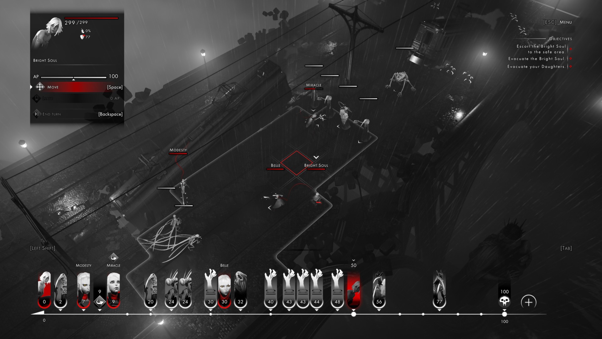 Rescue missions (aka. escort the VIP) are probably the most brutal ones in the entirety of Othercide. The goal here is to bring the VIP (aka. the Bright Soul) to the evac point and escape with your squad. The problem is that countless enemies will spawn. Due to narrow lanes, you’ll find your squad pinned down, out of AP, afflicted by the burst status/unable to act until later, and, well, basically dead.