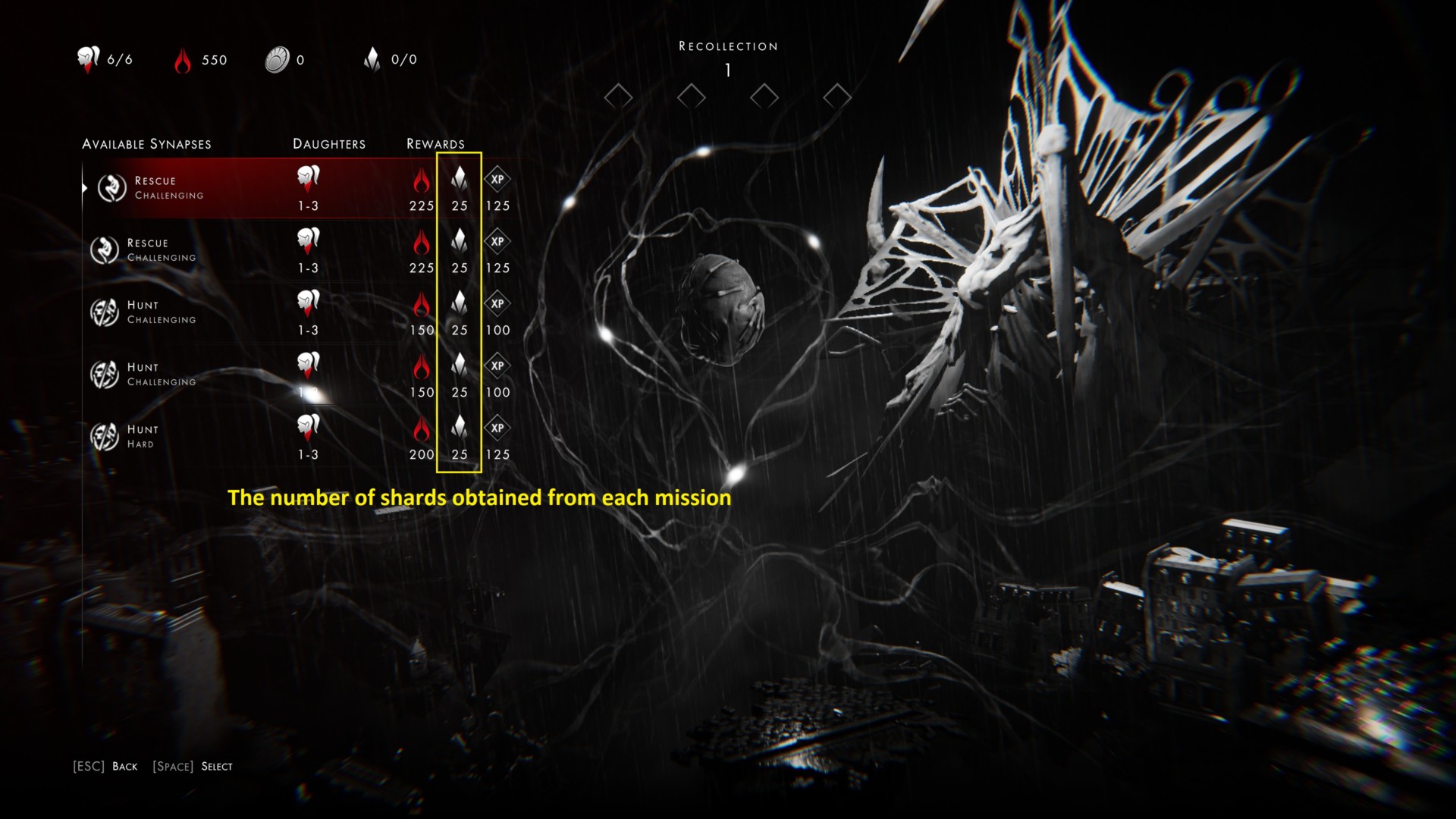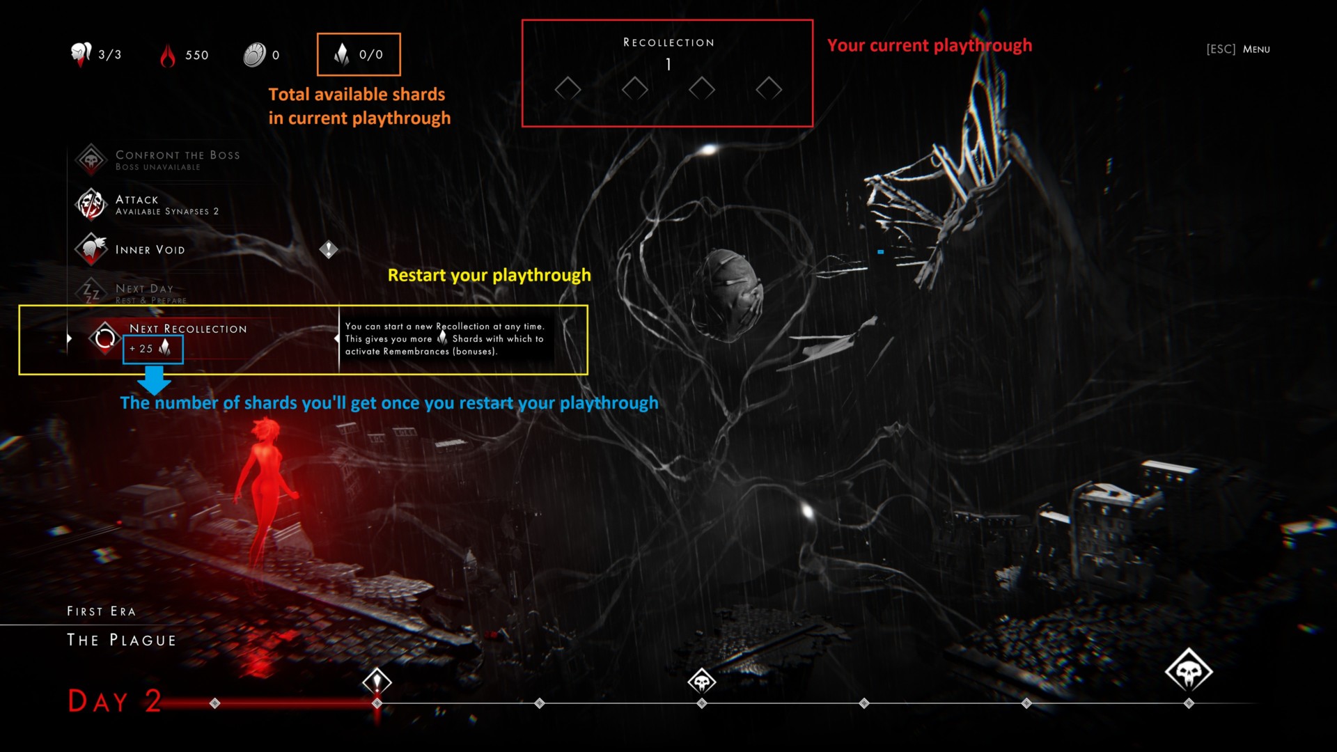 These shards, in turn, are used to activate Remembrances — helpful boosts and perks — that you’ve unlocked. The thing is, shards earned in missions don’t get actively added to the resource pool for your current playthrough/recollection. Instead, the game expects you to restart (aka. a new recollection) so that those shards become usable. You can click on the “Next Recollection” button at any time to restart immediately and activate a Remembrance using shards.