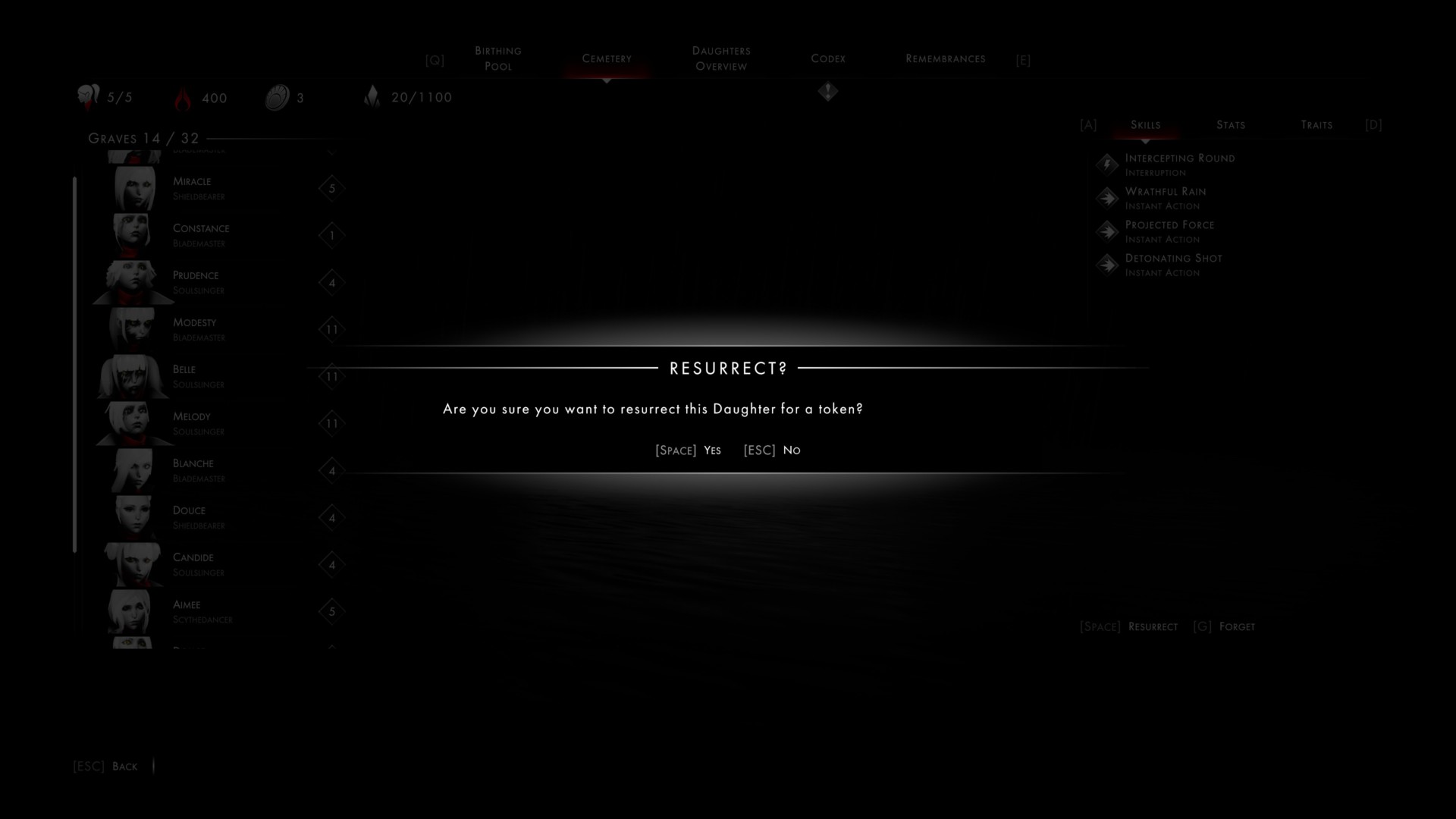 Once you have a Resurrection Token, you can open the Inner Void -> Cemetery tab. This will show you all the Daughters that have died in battle or those that were sacrificed during your Othercide campaign. Simply select one of them and use your token.