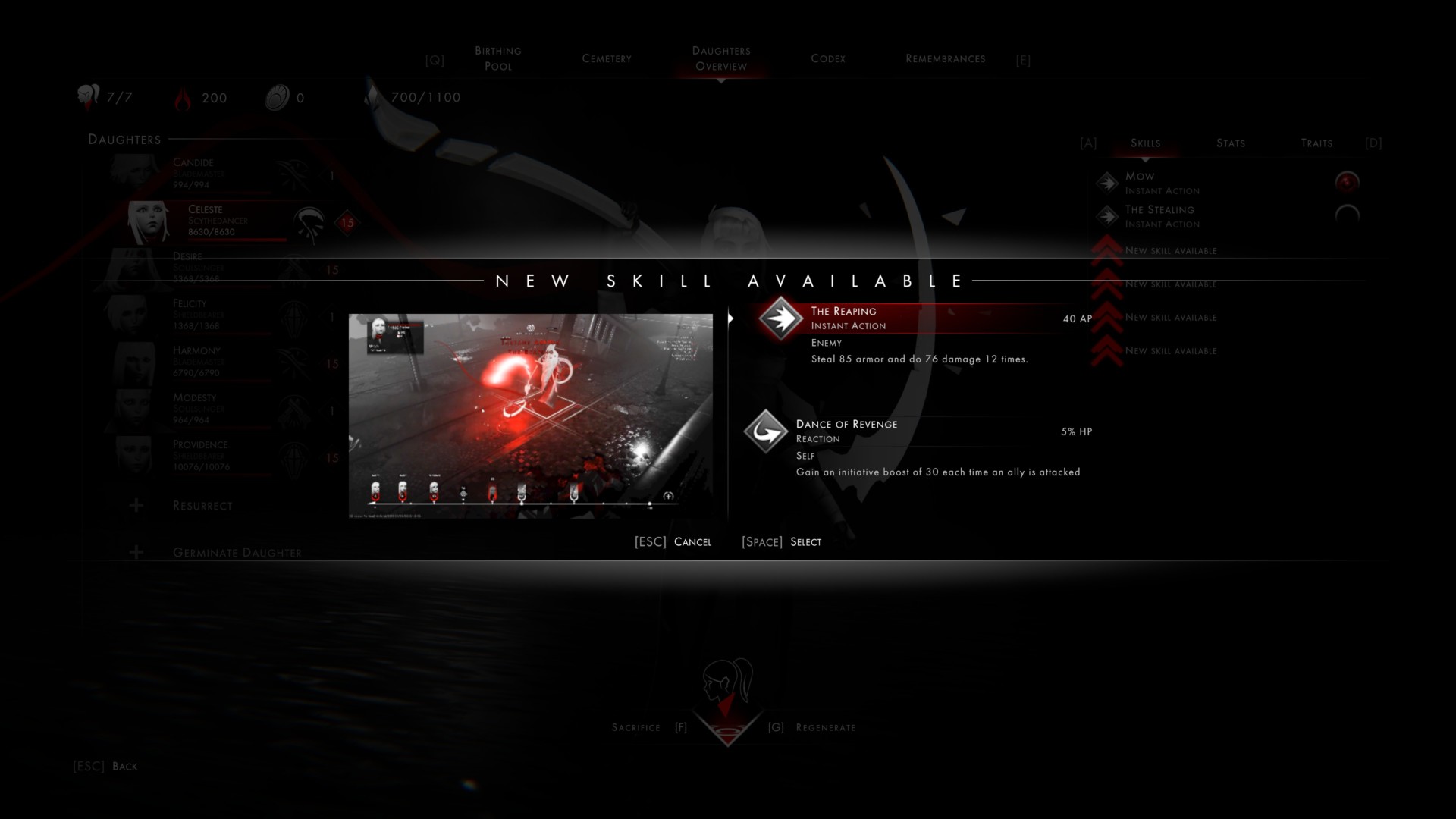 Just to be clear, you don’t actually get to select your first Scythedancer’s abilities (they’re pre-selected for you). However, if you decide to recruit new Daughters — and assuming you chose Remembrances that boosted you to a certain level — then you’ll get to pick from certain skill options.