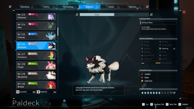 The Direhowl is a vicious wolf type of Pal that you can mount. Their Direhowl Rider skills will have them move faster than most mounts.