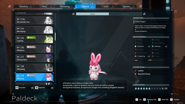 Ribbunny is an adorable punk rabbit with the ability to drop Beautiful Flowers. Its Skilled Fingers skill can increase the attack power of all Neutral Pals. Also, while working at a Weapon Workbench at base, your work efficiency will increase.