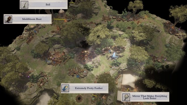 Once you’ve arrived, you’ll see the aforementioned portal talking to a random NPC who wants to find love. From there, go ahead and explore the area. You’ll notice piles of rubbish and chests scattered about. While you can pick up a bunch of junk, the most important items are the Extremely Pretty Feather, Mirror That Makes Everything Look Better, and Bell. Likewise, there’s a Moldbloom Root that’s required for the His Majesty’s Anguish sidequest.