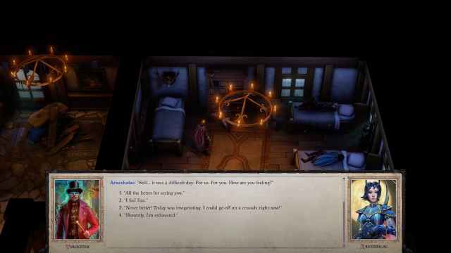 Going through the portal will make you arrive at the Razmir Palace stronghold. After a text RPG section, you will be left with your companions to fend yourselves against Razmir’s followers thanks to Rovus freeing us after disguising himself as a cultist. Explore the whole area and you will eventually get to the main Throne Room where you will fight Razmir himself…
