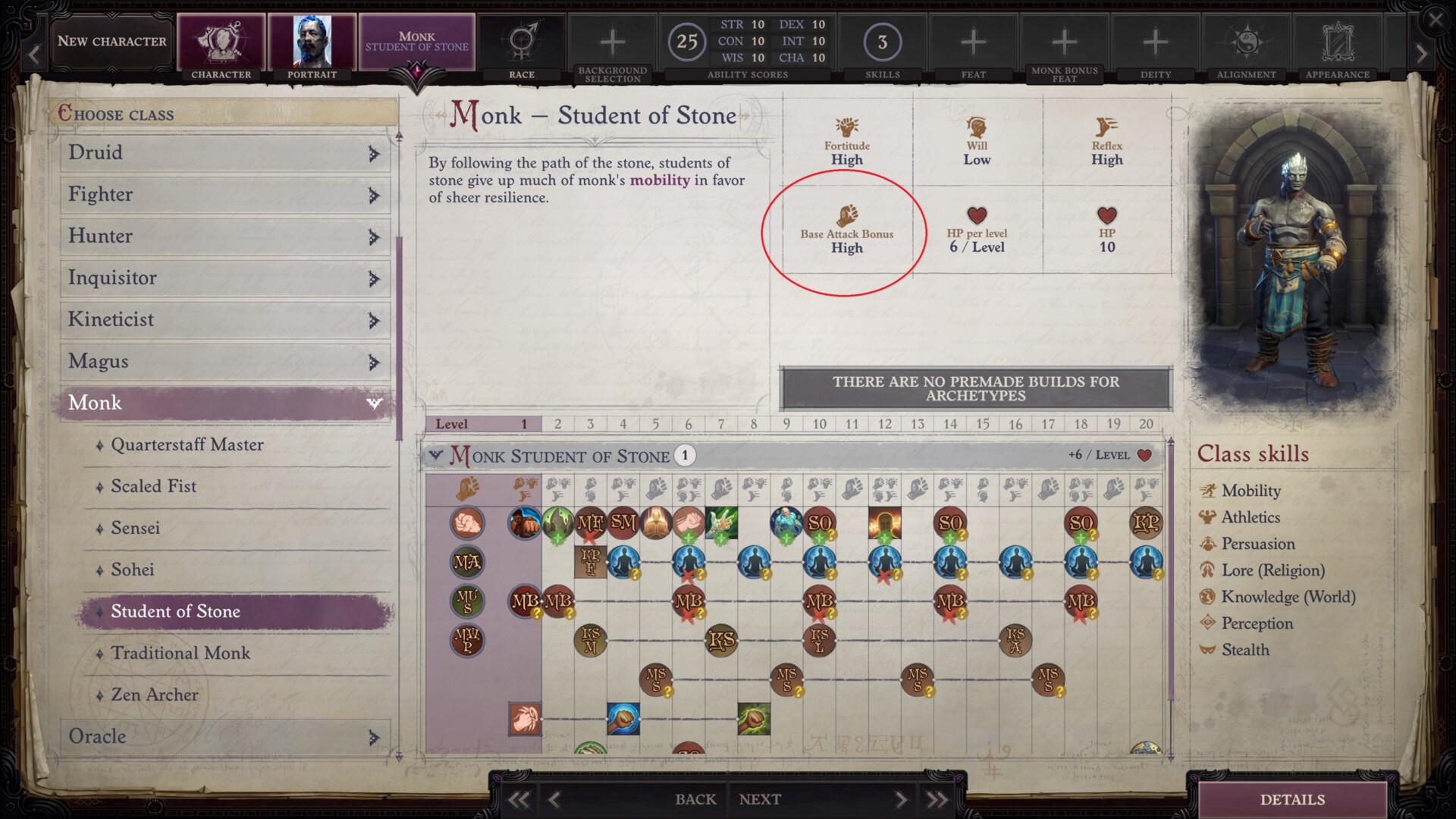 - Base Attack Bonus (BAB) – Base attack bonus refers to how you’ll land damaging attacks against enemies. The gist is that you’ll want classes that have high BAB growth. You can see this if you select a default class and click on the “Details” button. For instance, pure frontline melee classes like the Barbarian, Fighter, Paladin, and Slayer have high BAB growth. Meanwhile, ranged, hybrid, and support classes, such as the Alchemist, Kineticist, Magus, Cleric, Bard, and Skald have average growth. Lastly, pure caster classes have low BAB growth. If a prestige class requires you to increase your BAB to a certain value, then you’ll want to stick with a pure melee class for a few levels before swapping to something else that allow you to grab feats. You can see one particular example in the image below.