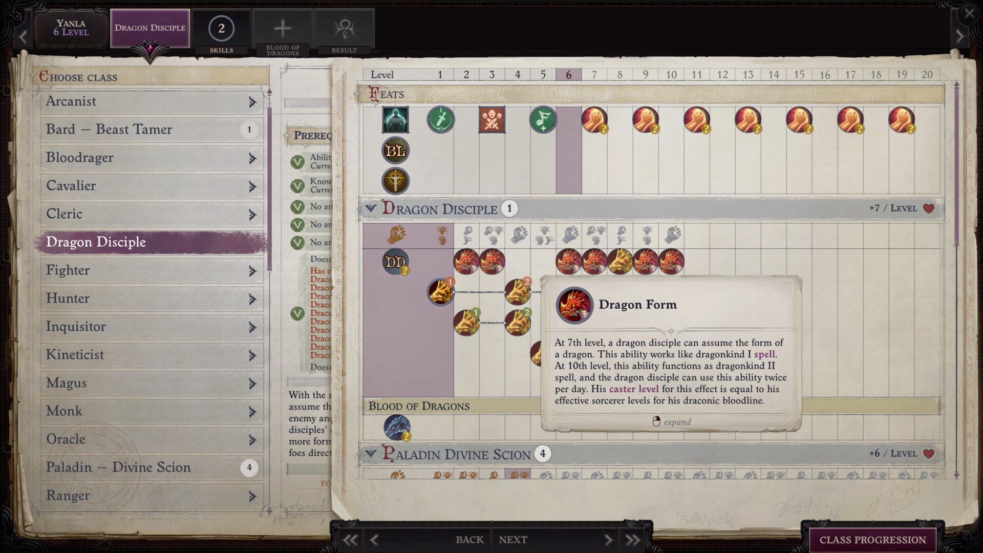 | Dragon Disciple | Skills: Knowledge (Arcana) 5 Cannot have: Empyreal Sorcerer, Sylvan Sorcerer, or Sage Sorcerer Archetype Cannot have: Bloodline class feature Spells: Can spontaneously cast Arcane lv. 1 | This is a great option for a prestige class. It’s actually what I did for my Paladin main. I had Paladin rank 4 and Bard rank 1 (for Inspire Ferocity and a couple of spells), which meant that this could be unlocked quickly. Just remember not to choose a Sorcerer or Bloodrager due to the restrictions. |