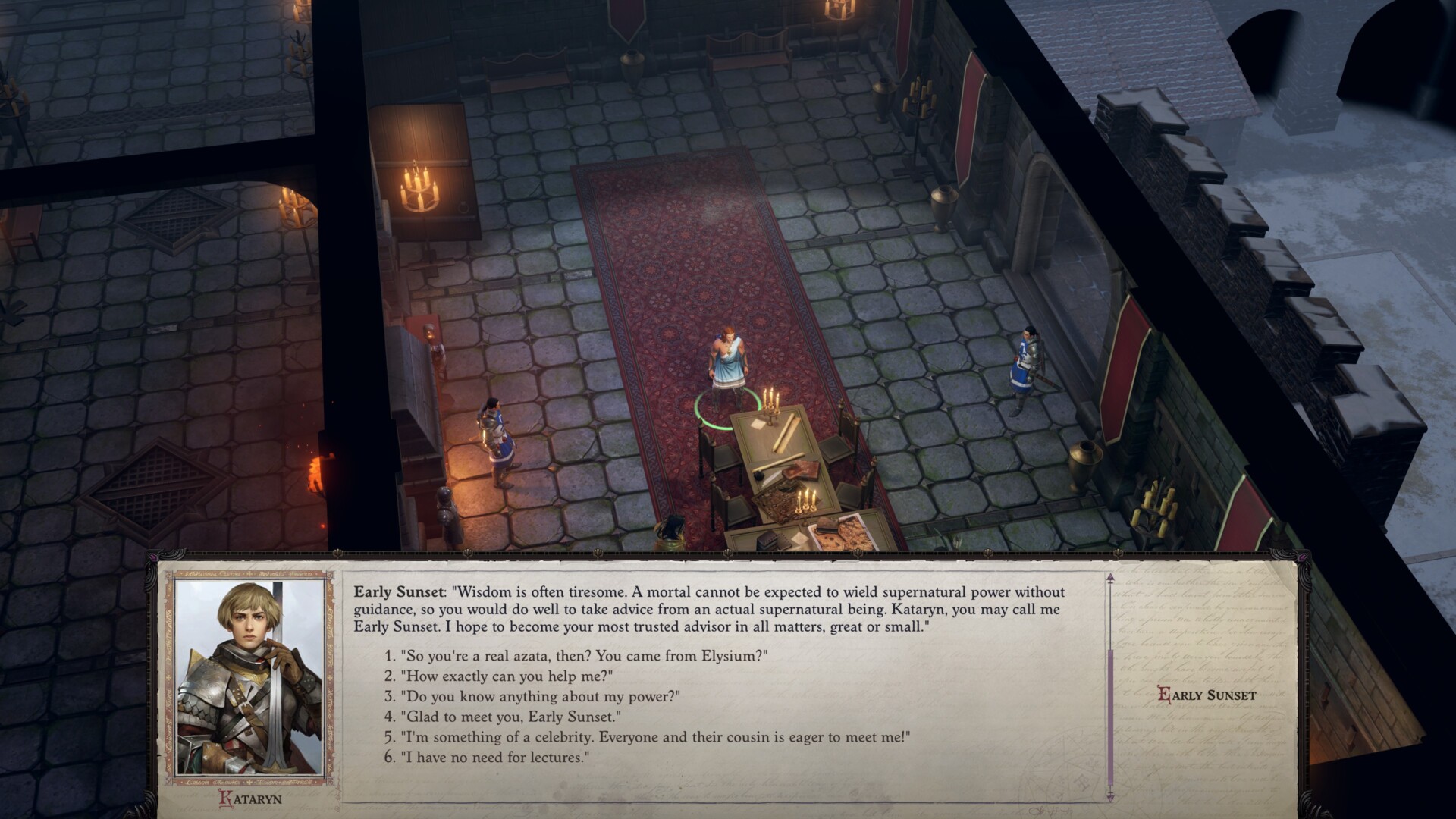 Then, in Act III, a unique advisor should arrive at your court. The Aeon path gets Melies the Devil, and the Azata path gets Early Sunset. You might need to complete a particular task first just so either Melies or Early Sunset would appear. For Azata, that means visiting your sanctuary/court that’s north of Drezen.