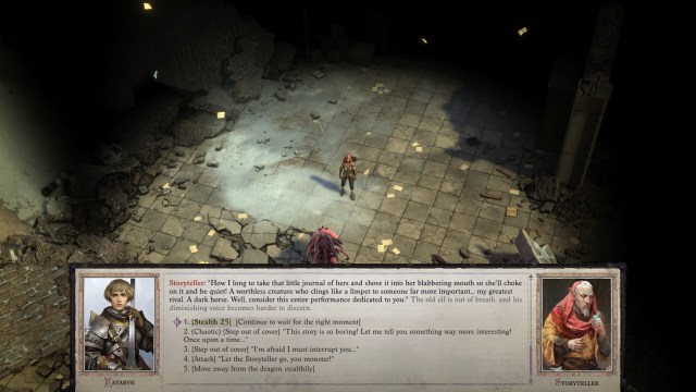 If you pass the skill checks, you’ll spawn at the edge of the tower. Here, you’ll see that the Storyteller is all alone against Devarra. There are two more skill checks here (Stealth 20 and Stealth 25) if you wish to be sneaky. After exhausting the dialogue options, you can step out of cover and attack.