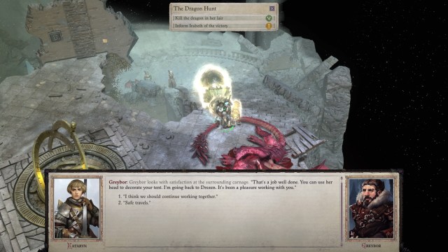 To progress further in The Dragon Hunt quest in Pathfinder: Wrath of the Righteous, go to the Half Measure Tavern in Drezen to recruit Greybor (you’ll need to pay him 2,500 gold).