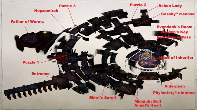 In any case, you’ll see a map of the dungeon below. Moreover, this guide section will focus primarily on the Ineluctable Prison puzzles in Pathfinder: Wrath of the Righteous. We’ll still talk about the other important tidbits, though this part will look at the three wall puzzles.
