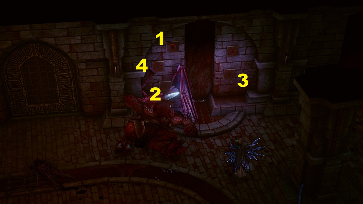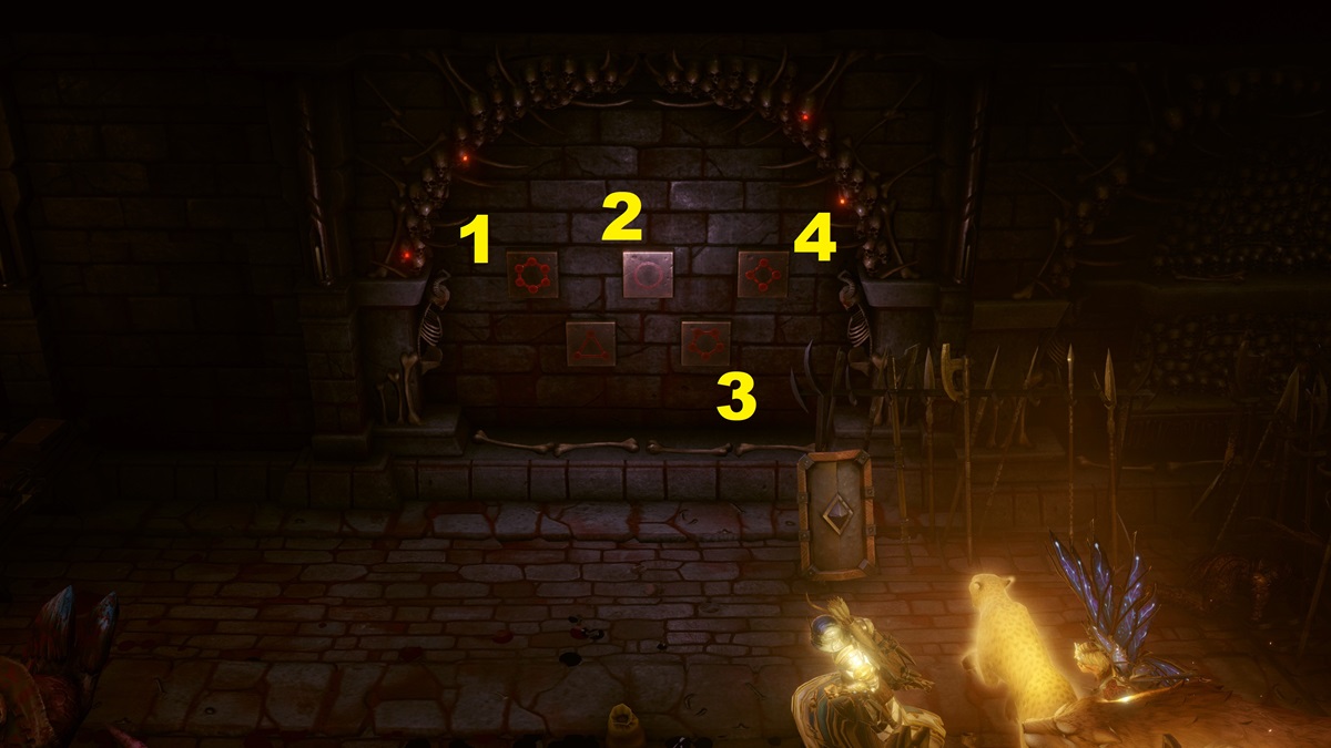 The second can be spotted as you make your way east then north, after taking out one of Baphomet’s Chosen. The solution is: Diamond -> Triangle -> Hexagon -> Pentagon. This particular puzzle rewards you with the Question Mask, which is an absolute necessity if you want to obtain all Nameless Ruins Masks, thereby opening the Enigma secret dungeon.