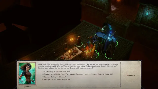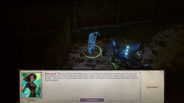 Choose the inquisitive dialogue options (i.e., don’t just attack or say that you don’t have time). Once you say that she shouldn’t have put her faith in her father, Baphomet, you’ll learn very important information about how Archpriestesses can summon Demon Lords at will. This is crucial, as it enables a special dialogue option at the end of the game, helping you unlock the Ascension secret ending.