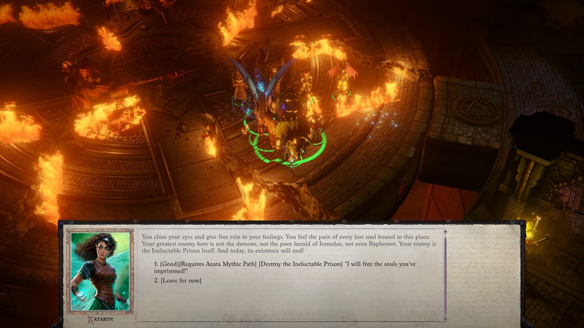The eastern section has one more Magic Circle that you can activate. But, before that, Baphomet’s statues will come to life. After destroying them, you’ll be able to move to the center of the platform where the Hand of the Inheritor awaits. This is followed by a two-phase fight where you’ll first deal with the boss and some minions, and then his burning angel form. When you’re done, you can decide on what to do with the Hand of the Inheritor in Pathfinder: Wrath of the Righteous: