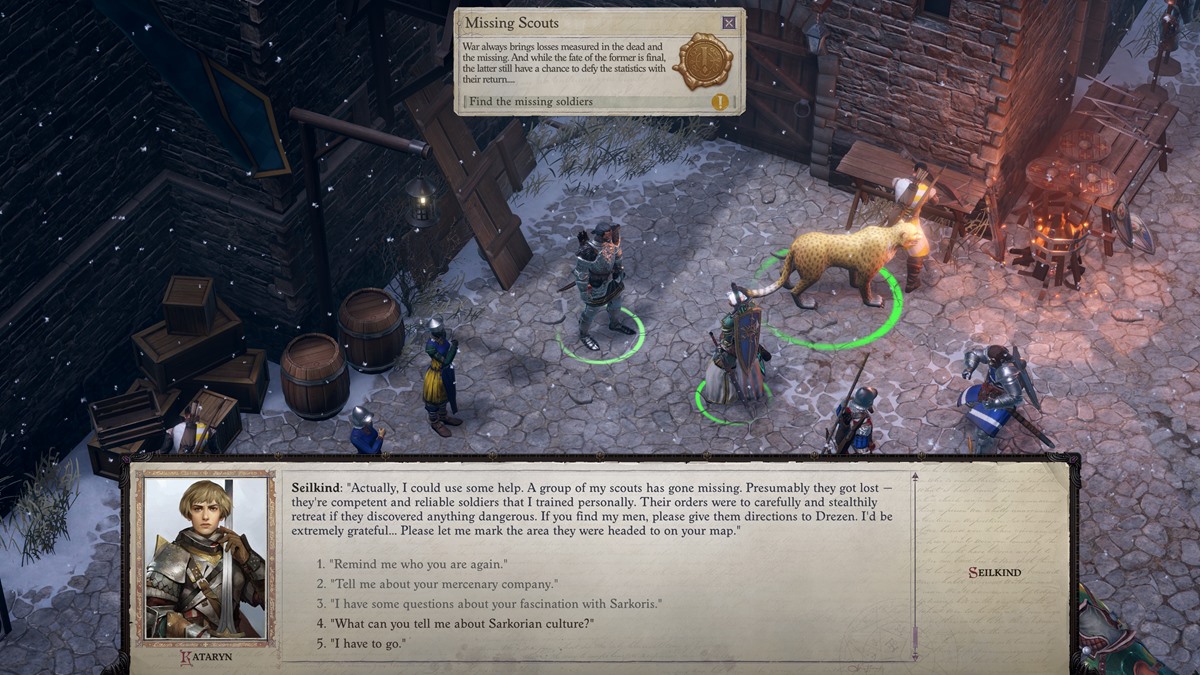 The Missing Scouts sidequest in Pathfinder: Wrath of the Righteous is given to you by Captain Seilkind. He’s right next to the barracks, close to where the other troops are training in the yard. You can accept the quest and ask him a bit about Sarkorian culture, too.