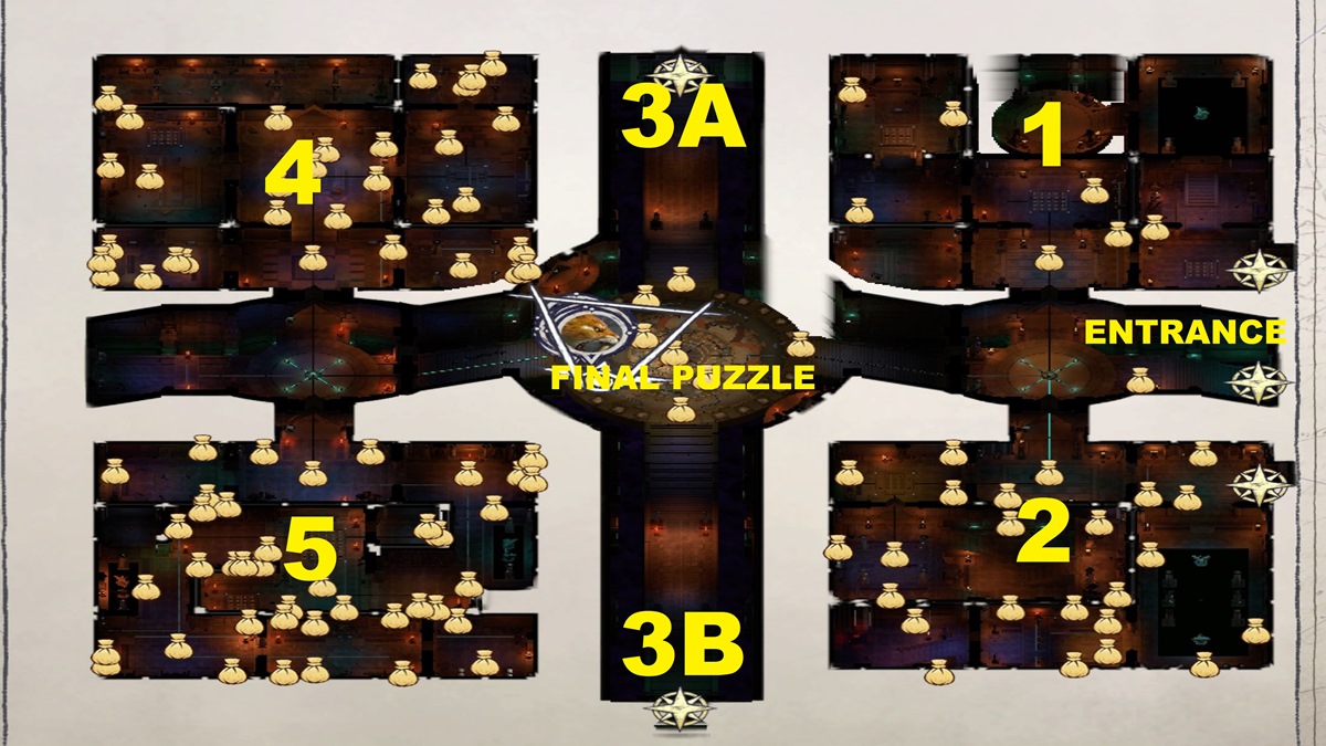 - When you find yourself back in the main area, you’ll notice a bunch of rooms have appeared. There are a couple of puzzles here, as well as several crystals. Try to avoid interacting with any of the treasure coins as you might get debuffed.