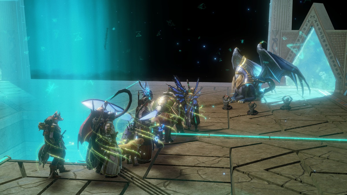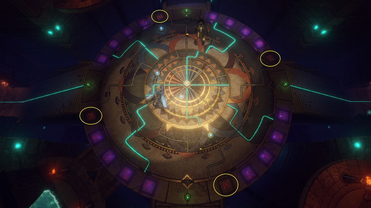 This one requires you to do the opposite: green crystals in the outer rim, blue crystals closer to the center, and grey/depowered symbols to the left of the lines. Be ready for a fight once you interact with the device. A hologram version of Areshkagal will show up, and you’ll need to battle it. Once it disappears, a portal will open that takes you to the top of the pyramid.