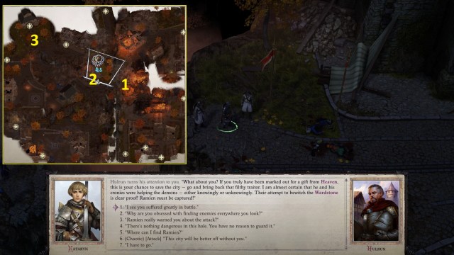 Explore Market Square until you find piles of rubble that you can traverse based on your Athletics skill (#1). You’ll then reach a ruined tower where the prelate Hulrun and his soldiers are accosting Ramien (#2).