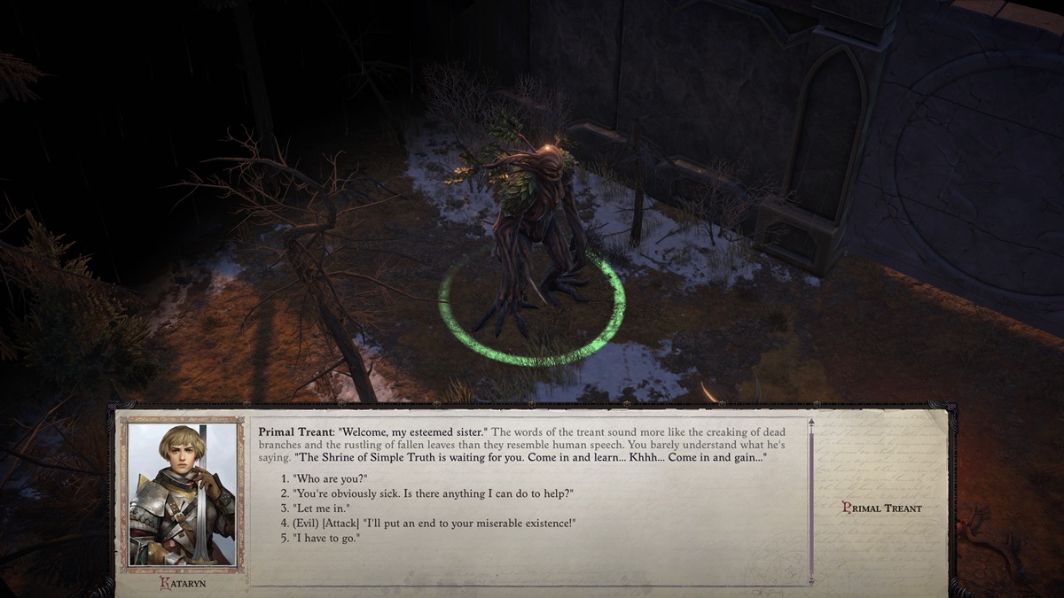 The Sacred Lands puzzle in Pathfinder: Wrath of the Righteous is part of the Weary Guardian quest. Upon arriving in the location, a Primal Treant will welcome you. You have the option to attack it, but I don’t suggest that at all. Instead, continue inside the ruins, whereupon the rest of your party will be left behind. That’s right, only your main character will venture forth.