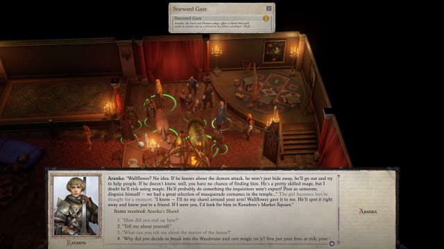 Travel here, fight the enemies, and enter the ballroom. While the peeps are partying, you can talk to the bard near the stage. That’s Aranka, and she’ll give you the Aranka’s Shawl quest item. Oh, and you can also recruit a companion named Daeran here.