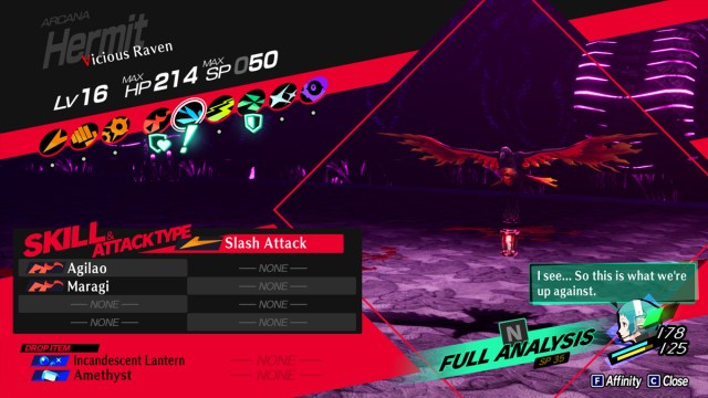 The Vicious Raven is strong against Wind, drains Fire, but is weak to Ice. It uses Agilao and Maragi to attack, so switch to a Persona that isn’t weak to Fire when fighting these guys. You can find all this information using Fuuka’s Full Analysis ability. The best strategy for taking down Vicious Ravens in Persona 3 Reload is using Mabufu. This Ice spell attacks all enemies on the field and sets you up nicely for an All-out Attack.