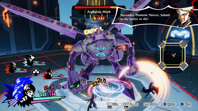 While Ryuji might complain that mechs are cheating, this fight against Akira isn’t too bad and you can mostly wail on it physically. Alternatively, switch to Makoto, use her special to imbue her FISTS OF JUSTICE with Nuclear, and then wail on it physically.