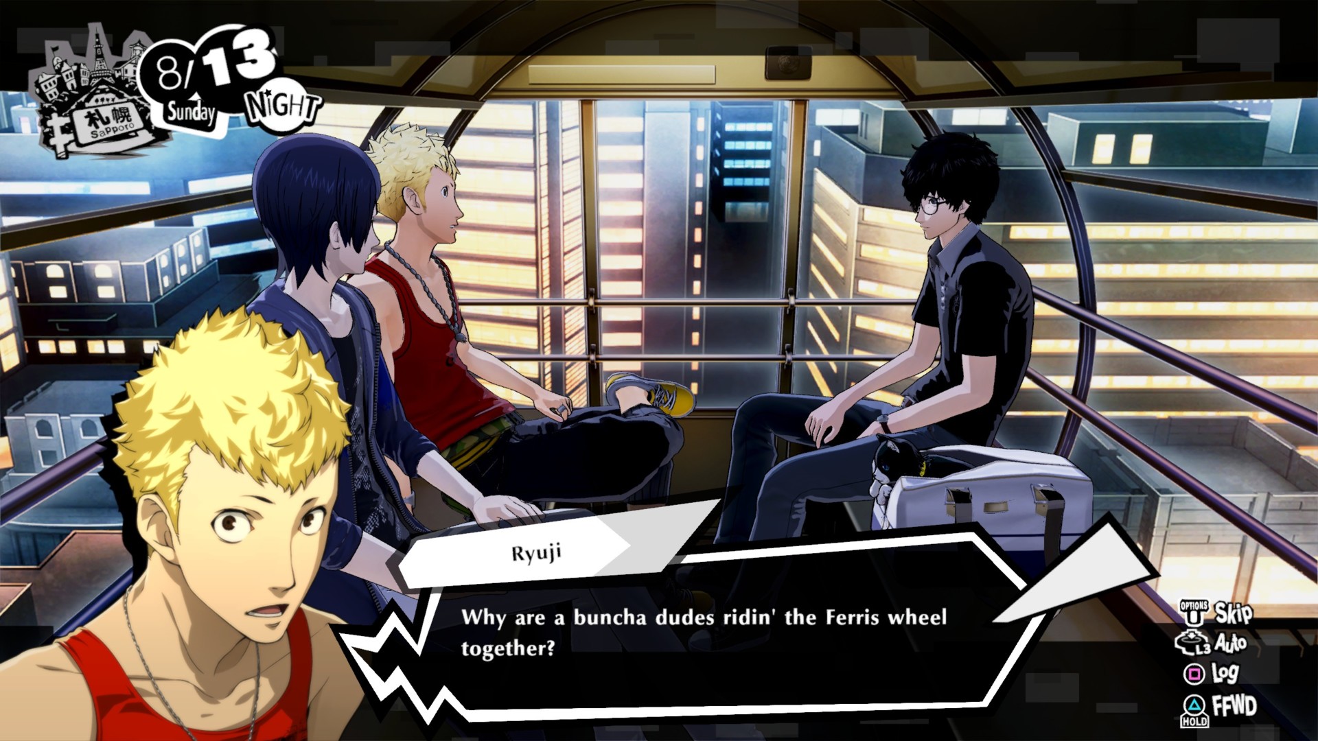 Persona 5 Strikers doesn’t have romances or social links in the traditional sense, but there are a few occasions where you can choose who to spend time with. Sapporo is one of those. Some way through the Phantom Thieves’ road trip you’ll get a bit of downtime in Sapporo, and you can choose who you want to take onto the Ferris wheel. Given how good the dialogue is, as well as the possibility of rewards down the line, it’s a tough decision.