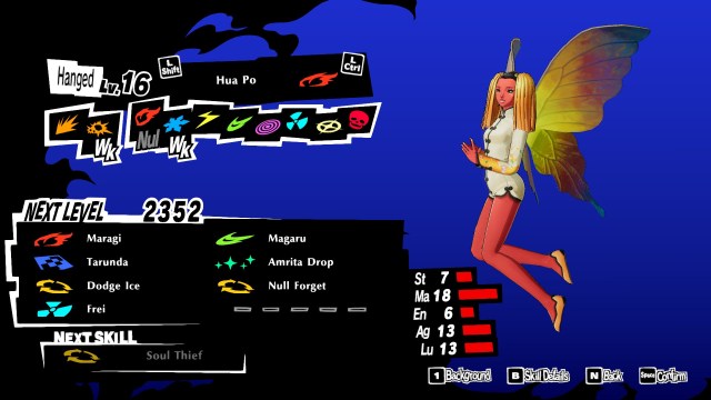 The important thing to note is that one of the Personas you can use to fuse all of these naturally learns the move the creation needs to learn. In this case, Hua Po learns Amrita drop at level 14. There are two choices for how to fuse Hua Po, though. One requires the Persona that Joker starts Persona 5 Strikers with: Arsene. But Arsene needs to be level 16 to be utilized in this capacity. You likely won’t have kept him in your lineup up to this point, but you can summon him and use Persona Points to get him to level 16. However, it’s much easier to summon a High Pixie and fuse them with Hua Po instead, as you’re certain to have one that meets the level requirements.