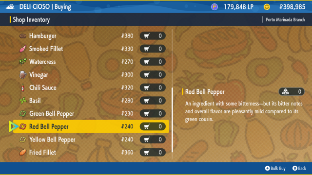 All three Bell Peppers can be bought at any of the Deli Cioso stores found throughout Paldea. The Green Bell Peppers cost 230 Pokédollars, while the Yellow and Red Bell Peppers cost 240 Pokédollars.