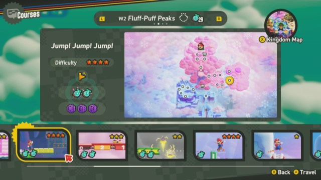 When you are viewing the world map, you might wonder which stages you have cleared completely. You can press the L button to bring up a list of relevant stages. Press L or R again to cycle between worlds. As you view level records, you’ll see a convenient log of any Wonder Seeds and large Wonder Coins gathered.