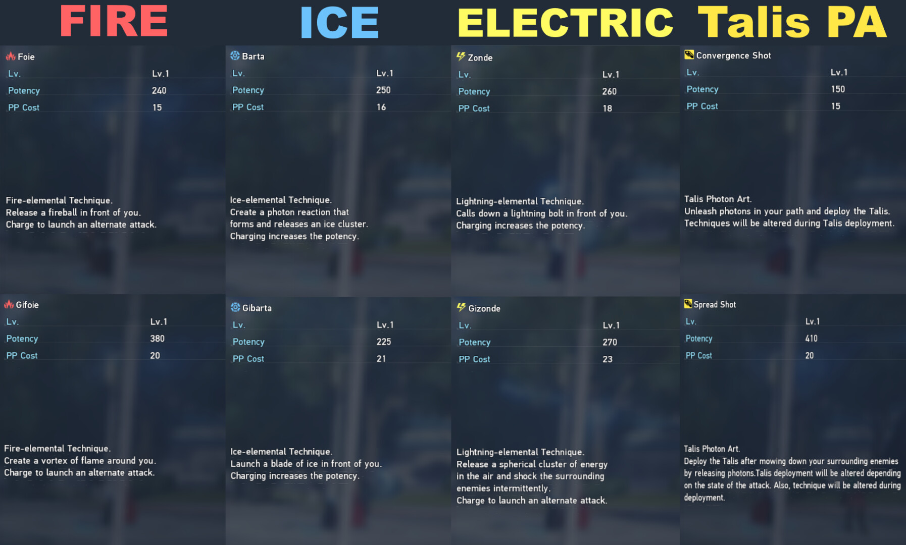 A lot of that same logic can be applied to talis, but there is one big difference. Before using Techniques either Convergence Shot or Spread Shot should be used first. These Photon Arts change how Techniques are cast. Convergence Shot changes them to be single target whilst Spread Shot gives them area of effect coverage. The former makes Techniques faster and less expensive PP wise whilst the latter makes it easier to hit multiple enemies at once.