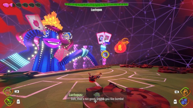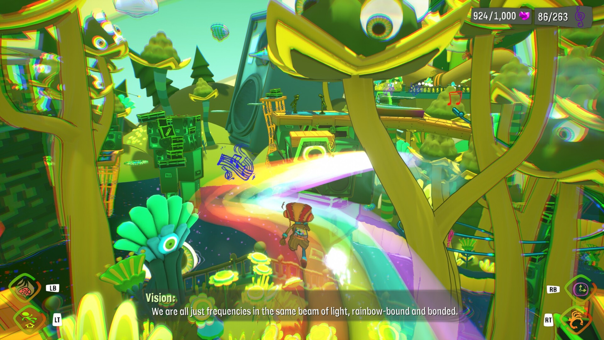 The only nitpick I can really hit Psychonauts 2 with is that the boss battles are infrequent and somewhat underwhelming. Most of them can be summed up as “Raz must dodge a giant enemy standing outside the arena” along with “you hurt them by shooting them.” They’re still interesting, but they alone feel like a step down compared to the last go-round, at least as far as mechanics go. The game is a good deal longer, though. I didn’t 100% it, but beating it and exploring to my heart’s content took me about 18 hours. The ending left me wanting, as things wrap up quite quickly, but every major character gets new dialogue once you beat the game, even if some of these don’t offer as much closure as I wanted.