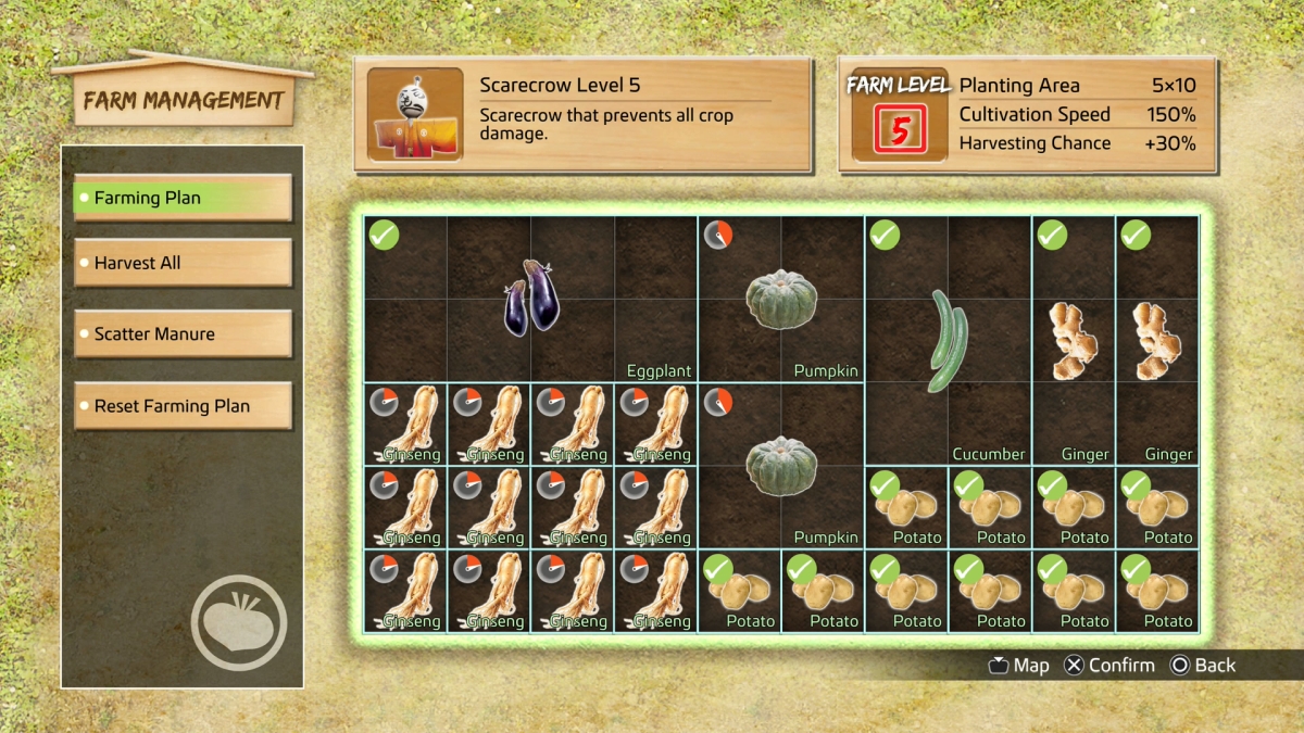 When you first acquire your garden, after gaining access to Ryoma’s Villa early in the campaign, you have only a small patch of soil. Spend Virtue first to expand its size. Then increase the variety of vegetables you can grow, and improve performance in general. You should also purchase a superior scarecrow, which causes you to lose fewer crops to vermin. All of these improvements cost Virtue, but you gain additional Virtue by regularly harvesting crops and then using them to cook recipes in your house.