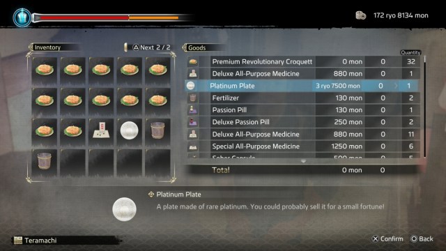 Fulfilling certain orders rewards you with bonus items, including the Fertilizer. You can also purchase it for 500 mon from the Manure Merchant who wanders along the edges of the main street through Rakunai. Fertilizer allows you to grow crops more quickly. By the campaign’s end, you should regularly be able to fulfill lucrative orders that yield multiple ryo at once. If you acquire extra crops of a particular type, you can sell them to pawn shops. The most expensive crops fetch a hefty sum.