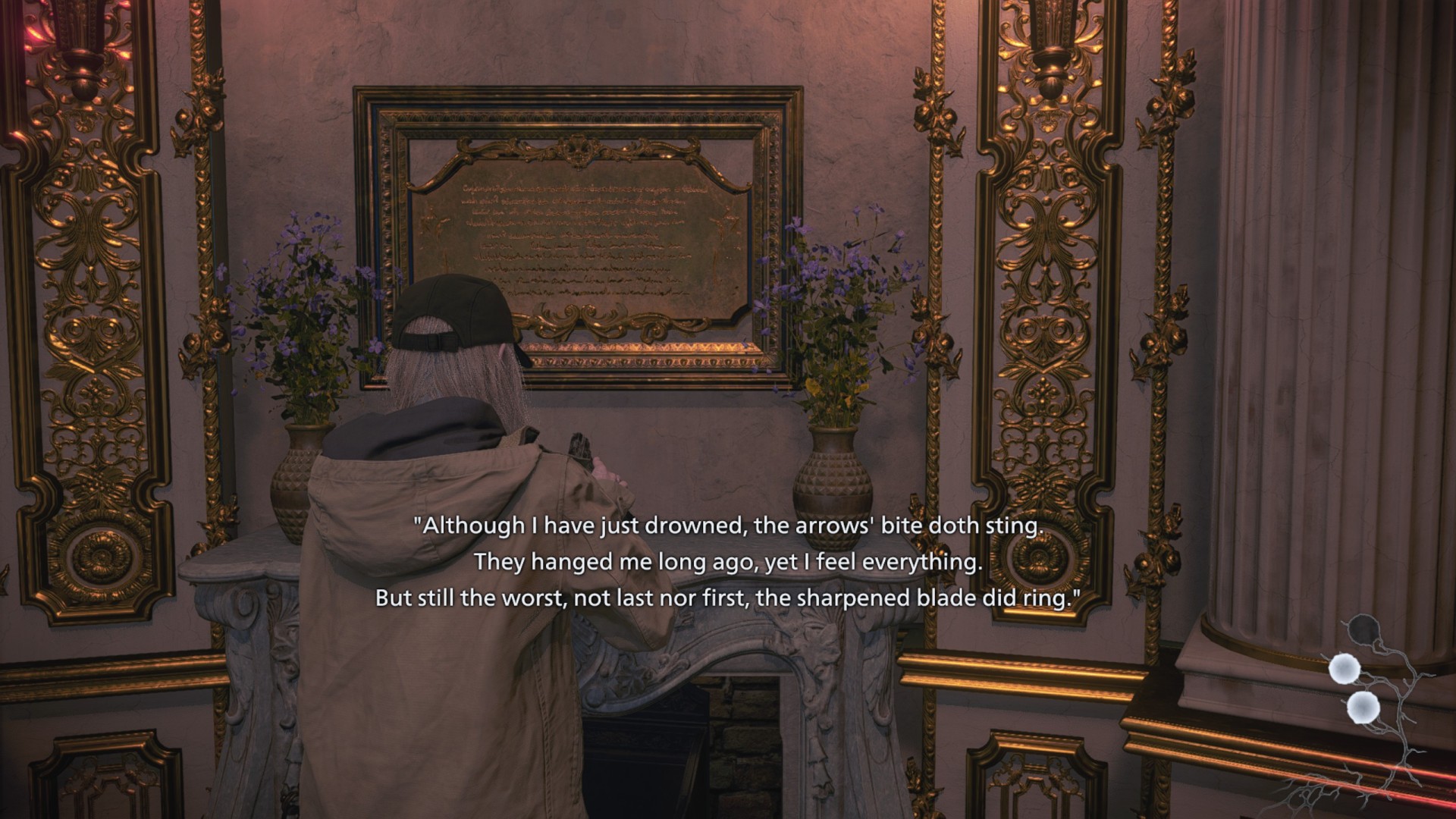 There are four statues, each depicting a different method of injury. You need to use the above text to figure out what order the four are in. “They hanged me long ago” makes it clear that hanging is first, so you’ll want to interact with the statue of someone being hanged. Stabbing is neither last or first, so you’ll want to hit that one next. The first line makes it clear that you next need to interact with the drowning statue and then the statue that has been shot with arrows. Once you do all of these in order, the bath will open up and you can proceed into the cellar, just like in the base game.