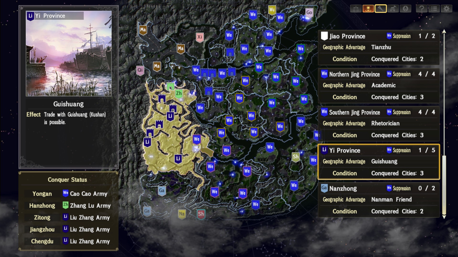 First, let’s talk about geographic advantages. This feature in the Diplomacy and Strategy Expansion Pack gives bonuses and perks whenever you control a province. For instance, Northern Jing Province has four cities (Xinye, Jiangxia, Xiangyang, and Jiangling). If you control at least three of these, you’ll gain the “Academic” perk that boosts doctrine and officer EXP.