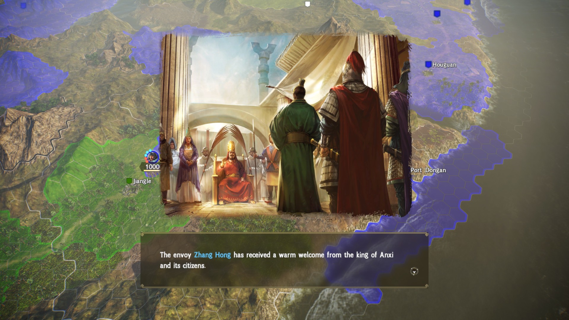 Now, if you do control certain territories, you may enact trade missions to four Eurasian nations. These are Tianzhu (India), Guishang (Kushan Empire), Anxi (Parthia), and Daqin (Roman Empire). A slightly similar mechanic applies when you send an envoy packed with items. Your chosen emissaries spend a dozen turns or so traveling from China to faraway lands before returning to your domains.