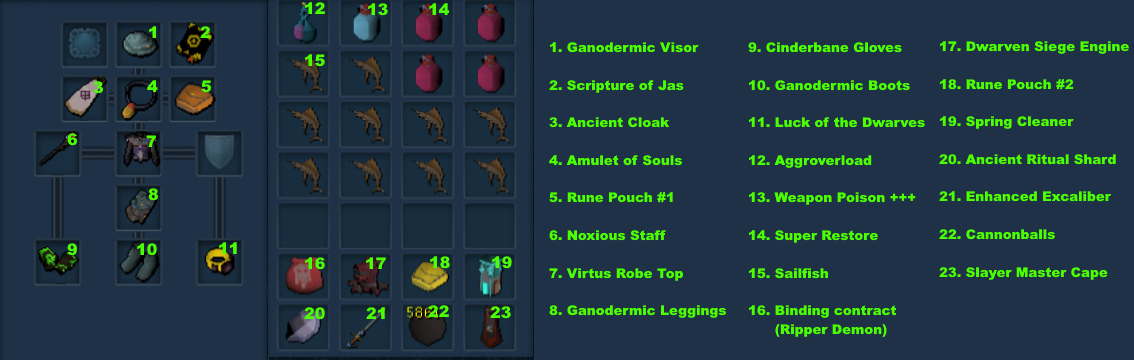The below equipment setup is a guideline for what is optimal. Not all listed items are necessary for this method, with many offering useful quality of life bonuses but little else. Examples of this are the Slayer Master Cape used to get desirable Slayer tasks more often, the Excaliber and Ancient Ritual Shard for regaining HP/Prayer, and the upgraded Dwarven Siege Engine cannon for additional passive damage.