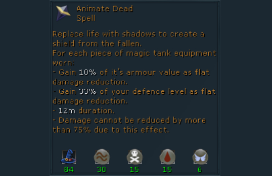As far as spells go in RuneScape, Animate Dead is one of the more unusual. It is a utility spell that focuses purely on buffing up your defense rather than dealing damage. The runes needed to cast it are 6 Soul Runes, 15 Blood Runes, 15 Death Runes, and 30 Earth Runes.