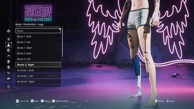 To add, there are also options for artificial limbs. Of these, there are many, and you can have one or all limbs be prosthetic. And, like with most clothing options, you can change up the color palette.