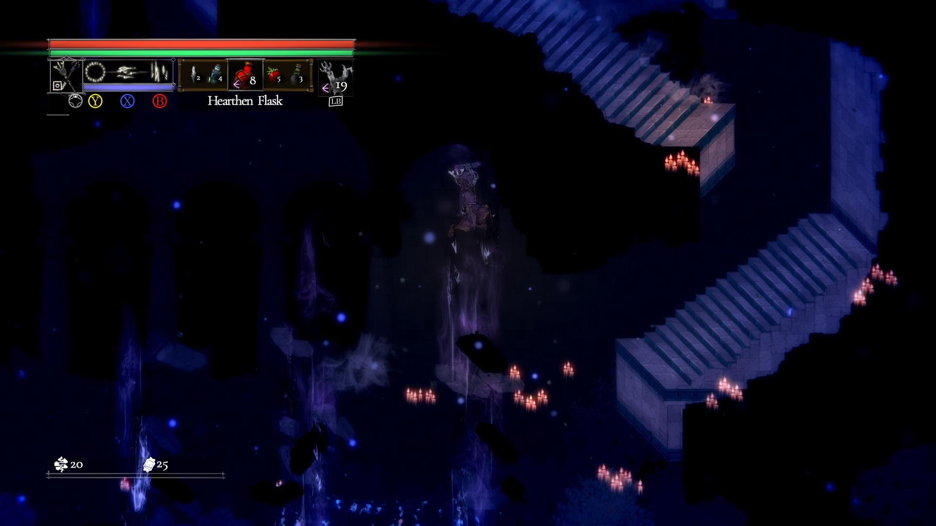 The basic spell (“LT” + “X” buttons) shoots multiple shrapnel in a single direction. Due to the boss’ size, all or most of the projectiles would hit for immense damage. The spellcasting is also cheap at only 3 MP. This allowed me to expend most of my mana to drop the target’s HP significantly before I had to use a potion.