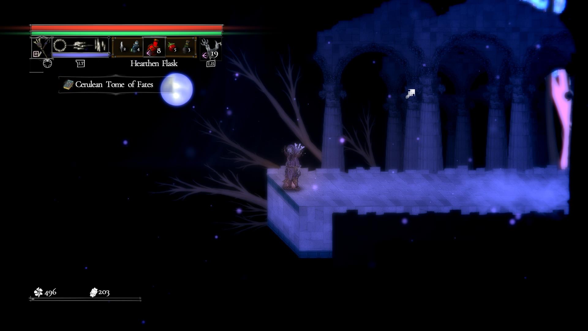 There’s an Obelisk in the next section. To the left, you’ll find objects that you can gather for flask/ammo refills. To the right, there’s a doorway that takes you to the outer area with an NPC.