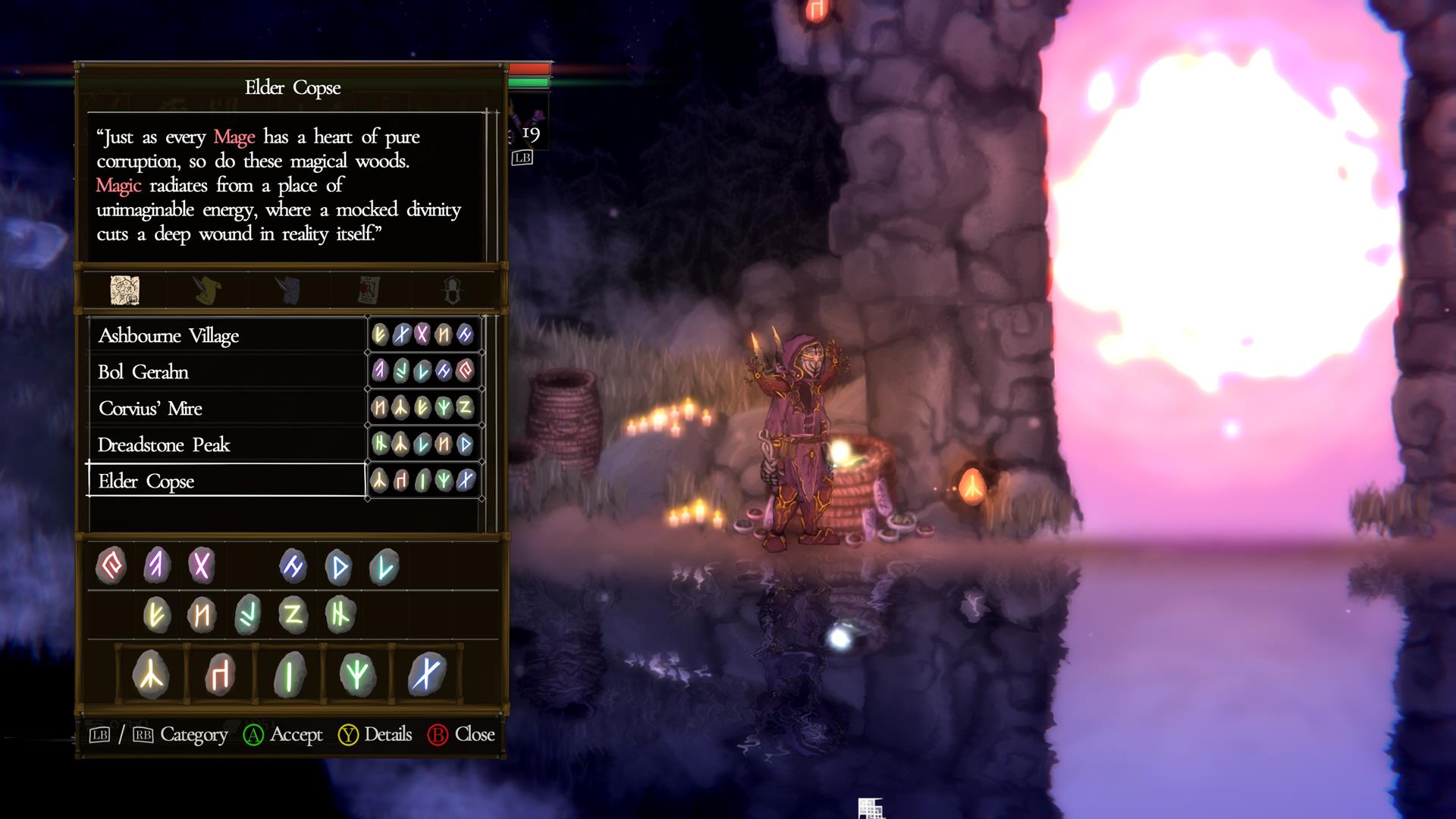You’ll wake up in Pardoner’s Vale, which acts as the main hub. This has several NPCs who provide upgrades or vendor wares. It also has a teleporter that leads to new zones once you find runestone combinations. This is perhaps the first notable departure in the sequel, that of five major zones (and another that you can visit later in the campaign) as opposed to a single, interconnected realm.