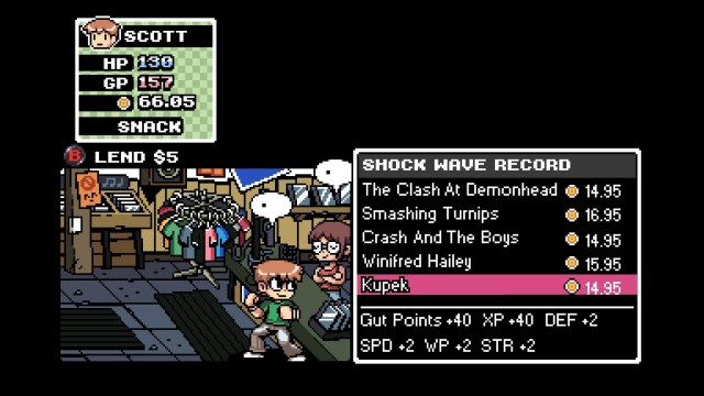 Initially, I had difficulty overcoming Scott Pilgrim vs The World: The Game Complete Edition’s sporadic difficulty spikes. I was getting my ass handed to me in a doggie bag, and there seemed to be no way to pull out of this vicious cycle of self-flagellation. That’s when I remembered that purchasing specific items in the game’s retail establishments can also be used to artificially boost your combat stats and abilities. All it took was one time emptying my wallet in the shopping district’s record store, and I was suddenly so far ahead of the competition that I coasted through the remainder of the narrative.
