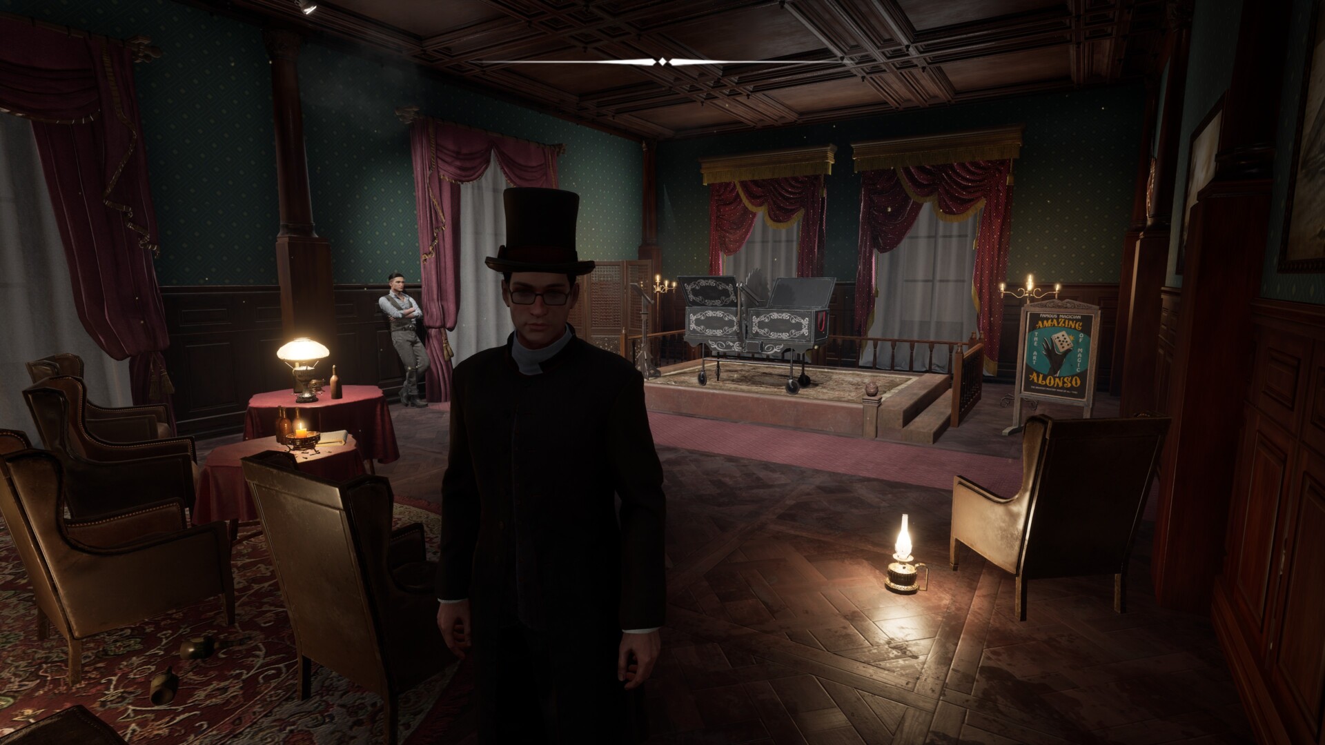 - Second-floor room – The suspect was climbing over the magician’s box and through the window.