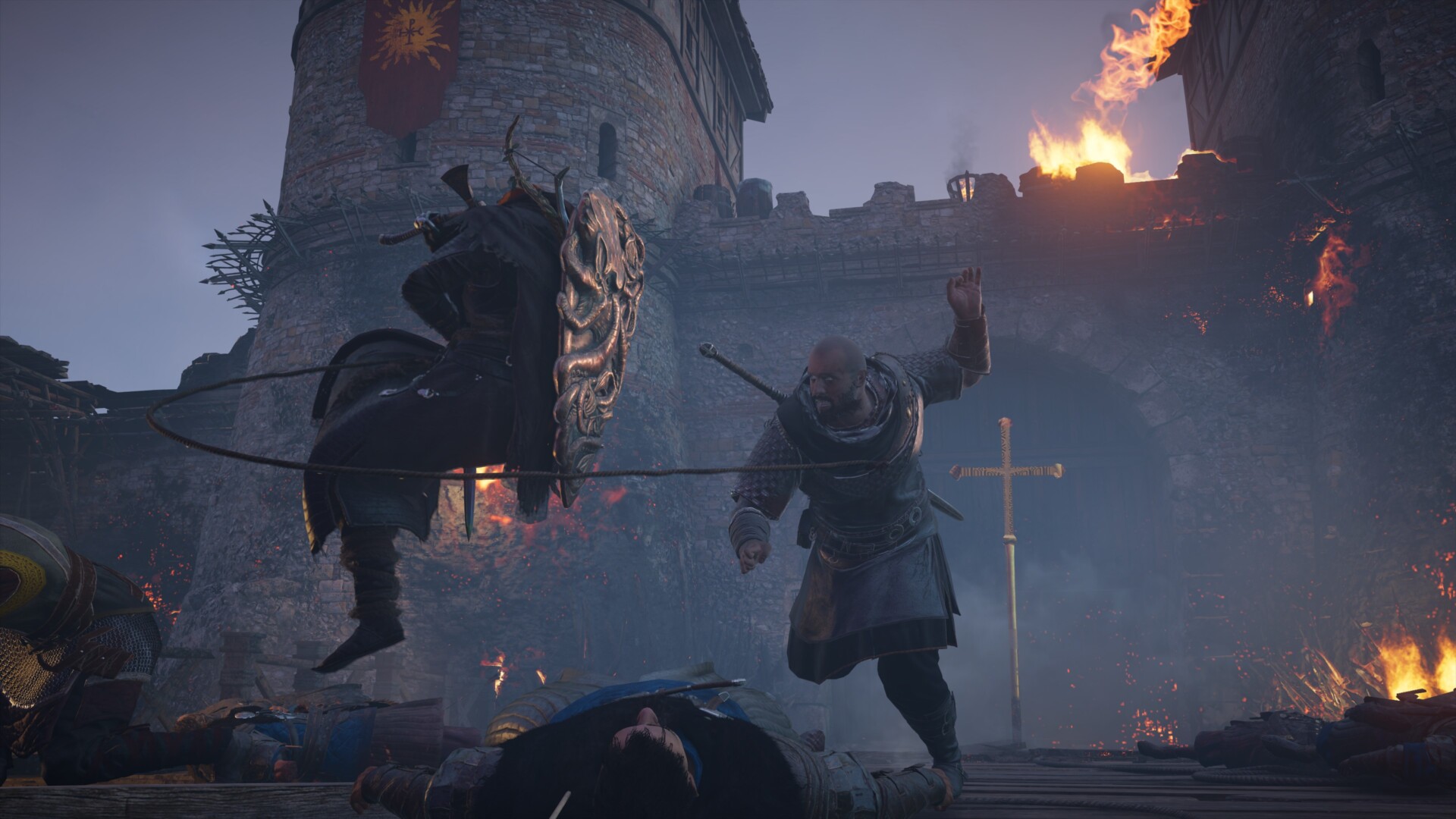 Then, you’ll follow Sigfred and co. as they fight their way through the streets. Toka will also ask you to light the braziers on the towers to direct the catapults.