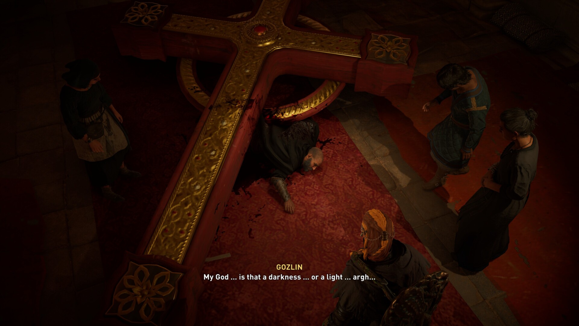 Once you open the door, you’ll be told of an assassination event/cinematic assassination. If you go to the back of the corridor, you can shoot an arrow at the explosive jars. This will cause the large cross to fall down and crush Bishop Gozlin. This is followed by a short cutscene where Sigfred succumbs to his berserker rage and bloodlust, and Eivor can do nothing about it.