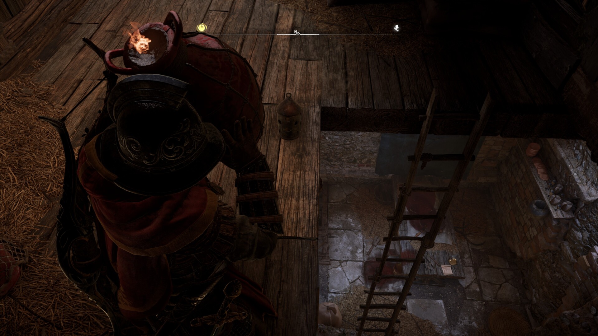 Climb the ladder to find an explosive jar. You probably won’t find an angle that lets you throw it directly at the breakable floor. Instead, you’ll have to go around the tower, using the beams so Eivor doesn’t drop the jar.
